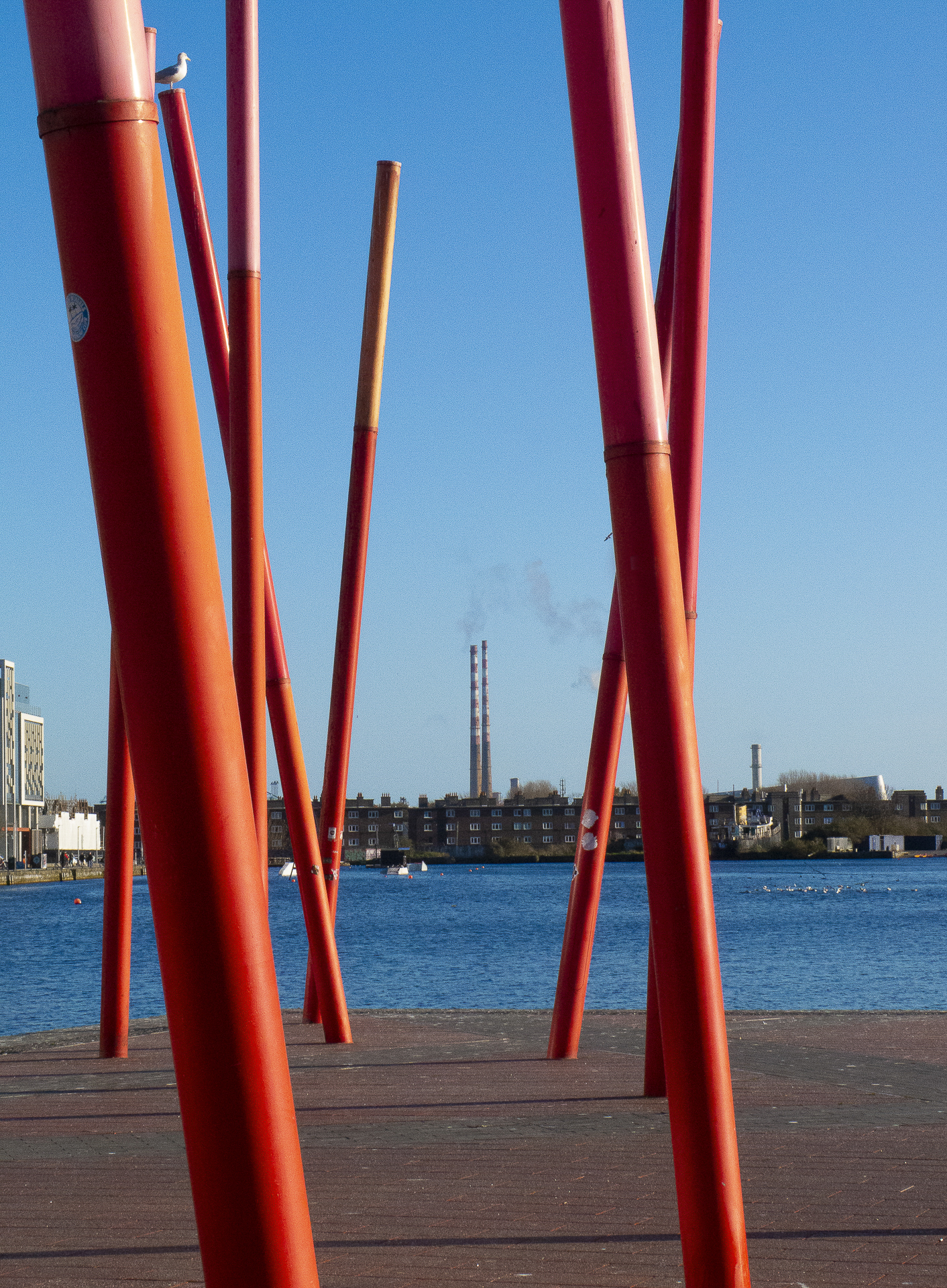 Dublins Poolbeg Chimneys visible from between the poles outside the Bord Gais Energy Theatre in Grand Canal Dock