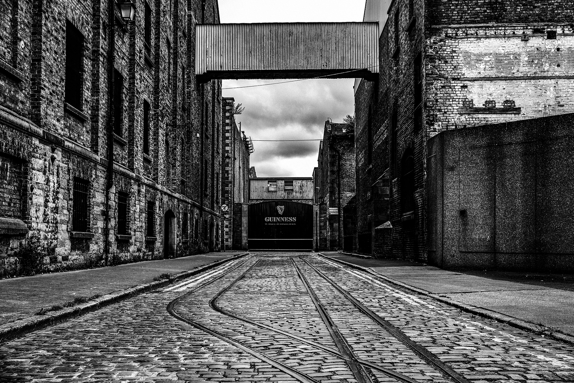 The iconic black Guinness gate with the old rail tracks running up Rainsford Street towards them.